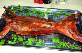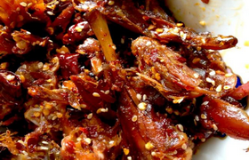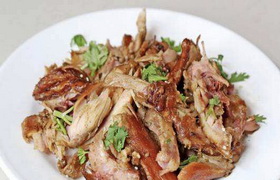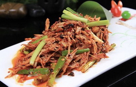 烤全兔同烤全羊一样,逐渐热销冬季餐桌。此菜选用草原养殖兔,没有兔腥味,撕开兔子肉一股香喷喷的热气扑鼻而来。兔子先卤后烤、表皮酥脆,肉嫩软烂、细嫩,加之三种不同口味的蘸料,非常有特点。
