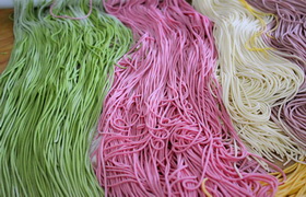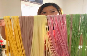 手工五彩面,是用各类果蔬汁配制的彩色面条,对比传统面条而言,其营养更为丰富,且色彩艳丽,深受消费者们的喜爱。