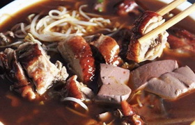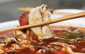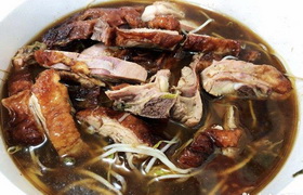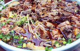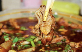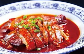 冒烤鸭是成都的特色美食,以千寻冒烤鸭最为有名,它结合了北京烤鸭的皮脆肉嫩和四川特有的冒菜吃法,将烤鸭切块后放到冒菜的汤锅里烫一下,加上冒菜就是一钵热气腾腾,荤素搭配,鲜香四溢的四川特色的 冒烤鸭。