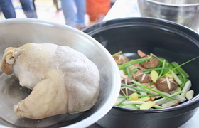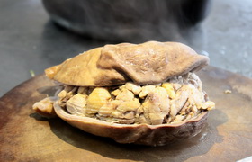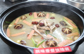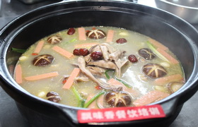 猪肚包鸡,是一道广东省传统的地方名菜,属于客家菜系,又名猪肚煲鸡、凤凰投胎,流行于广东的深圳、惠州、河源、梅州等粤东一带,是广东客家地区酒席必备的餐前用汤,汤里浓中带清,有浓郁的药材味和胡椒香气。