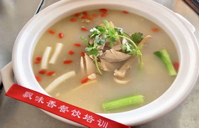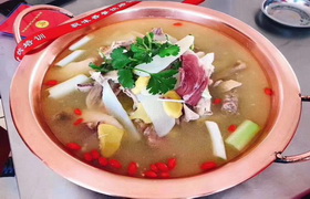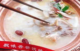 天麻火腿鸡火锅适合在冬天吃,暖身子,鸡汤浓厚,味道鲜美。