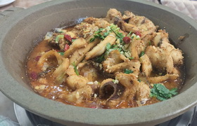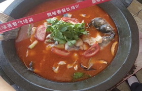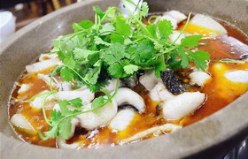 石锅鱼也叫金福鱼,是湘菜中的一道名菜,制作方法独特,用一块大的花岗岩岩石凿成有双耳的石锅,将鱼放在石锅内烹煎,然后,再加上以辣椒为主的各式佐料,又再加上一些滋补药材制成。湘菜的最大特色之一就是以“辣”为主,“石锅鱼”也不例外。石锅内,煎得焦黄喷香的鱼在引导你的唾液急剧分泌,那红彤彤的辣椒,还有其它的富于营养的佐料,就这样引发你旺盛的食欲,令人有“欲罢不能”之感。