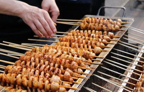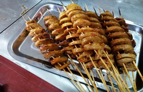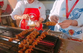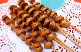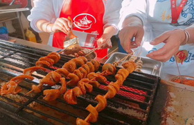 烤面筋是一种传统特色小吃,具有香辣味、孜然味等口味。主要是将面筋制作成螺旋状坯料,放置于炭火上进行烘烤,撒上调料、酱汁即成。
