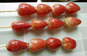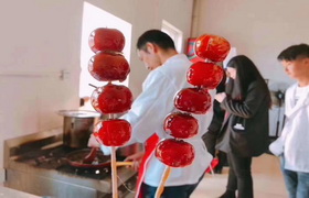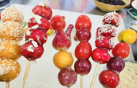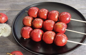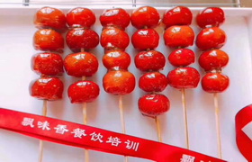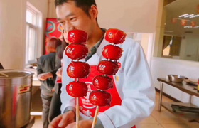 冰糖葫芦又叫糖葫芦,在天津又称糖墩儿,在安徽凤阳叫作糖球。冰糖葫芦是中国传统小吃,它是将野果用竹签串成串后蘸上麦芽糖稀,糖稀遇风迅速变硬。北方冬天常见的小吃,一般用山楂串成,糖稀冻硬,吃起来又酸又甜,还很冰。