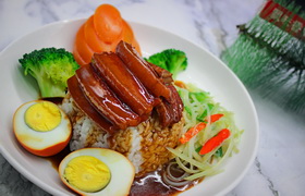 卤肉饭是江南一带的传统名小吃,制作原料主要有猪五花肉、鹌鹑蛋、米饭等,肥而不腻、甜咸适口、香浓四溢。带有厚重口感的卤肉,配上一碗蒸的不软不硬的白饭,每一粒米都吸透黑红的汤汁。